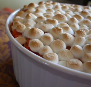 3. Bake, uncovered, in a 375 degree oven 30-40 minutes or till glazed. Sprinkle marshmallows over top. Bake about 5 minutes longer or till lightly browned.
